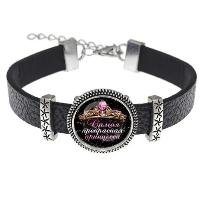 Кожаный браслет с изображением «Самая прекрасная принцесса» станет замечательным аксессуаром для любителей оригинальных украшений. Этот стильный и элегантный браслет выполнен из высококачественной кожи, металла и стекла, что обеспечивает долговечность и комфорт в носке.