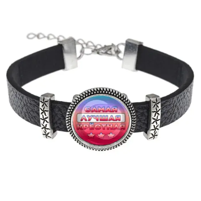 Кожаный браслет с изображением диаметром 18 мм под выпуклой стеклянной линзой — это идеальный подарок для крёстной. Он символизирует заботу и уважение, а также станет стильным аксессуаром. Регулируемый размер позволяет носить его на любой руке, а качественные материалы — кожа, металл и стекло — обеспечивают долговечность изделия. Упакован в прозрачный пакет, что делает его готовым к подарку.