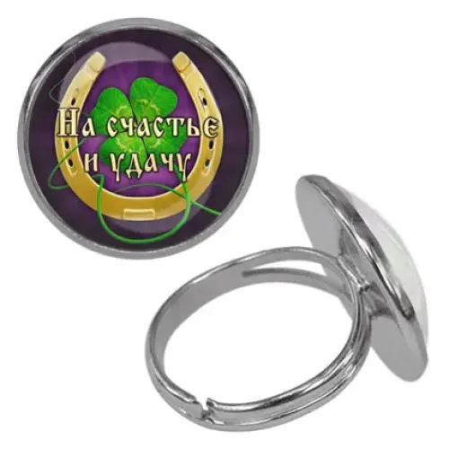 Безразмерное кольцо 'На счастье и удачу' — сувенирный аксессуар из бижутерного сплава с выпуклой стеклянной линзой.