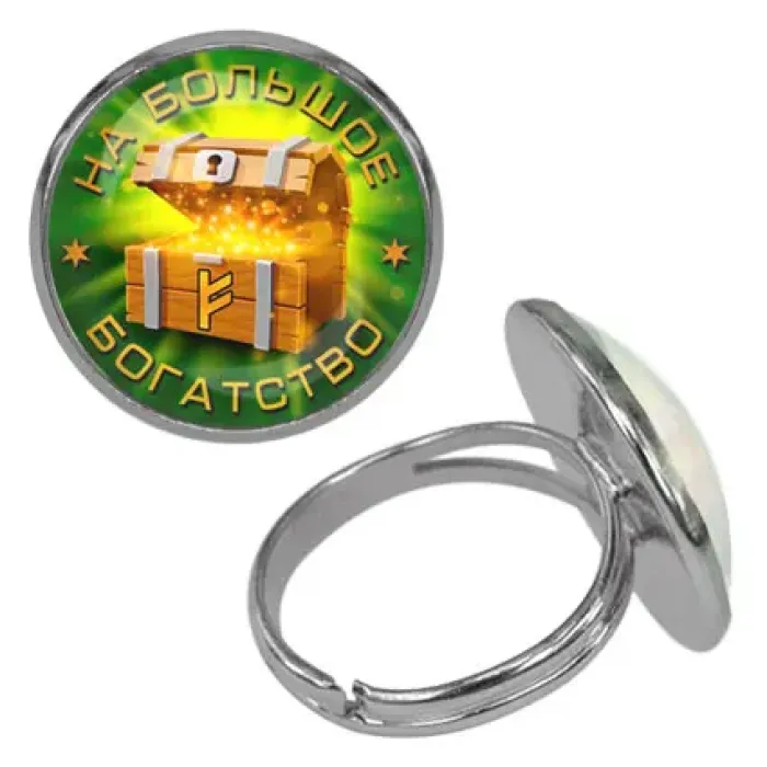 Безразмерное кольцо «На большое богатство» — сувенирный аксессуар из бижутерного сплава с изображением под выпуклой стеклянной линзой.