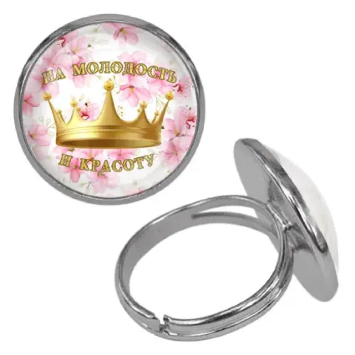 Безразмерное кольцо 'На молодость и красоту' — сувенирное украшение из бижутерного сплава с дизайном под выпуклой стеклянной линзой.
