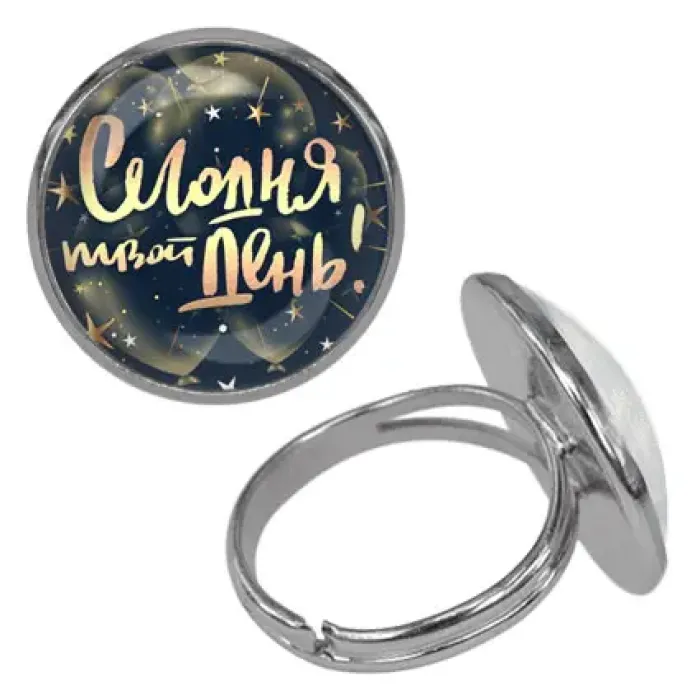 Безразмерное кольцо 'Сегодня твой день!' — это стильный аксессуар, который станет прекрасным подарком для любого повода. С диаметром изображения 18 мм и выпуклой стеклянной линзой, оно привлекает внимание и добавляет яркие акценты в образ. Изготовлено из бижутерного сплава с покрытием под серебро, что обеспечивает долговечность и привлекательный внешний вид. Упаковано в прозрачный пакет, что делает его идеальным для подарка или личного использования. Это кольцо символизирует радость и позитивные эмоции, идеально подходит для празднования особых моментов.