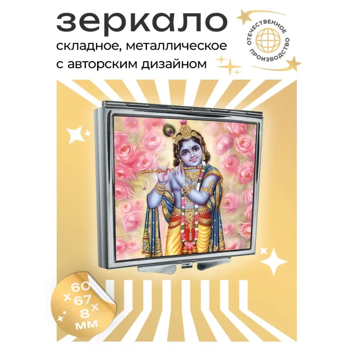 Складное квадратное зеркало с изображением Кришны. Материалы: металл и стекло.