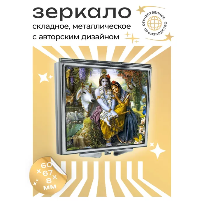 Складное зеркало квадратной формы с изображением Кришны и Радхи станет не только практичным аксессуаром, но и символом любви и гармонии. Это изделие выполнено из качественного металла и стекла, что обеспечивает долговечность и стильный внешний вид.