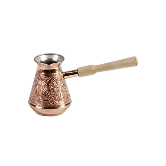 Медная турка для кофе объёмом 370 мл предназначена для приготовления ароматного и насыщенного напитка. Изготовленная из высококачественной меди, она обеспечивает равномерное распределение тепла, предотвращая пригорание кофе. Съёмная деревянная ручка добавляет удобства в использовании и уходе.